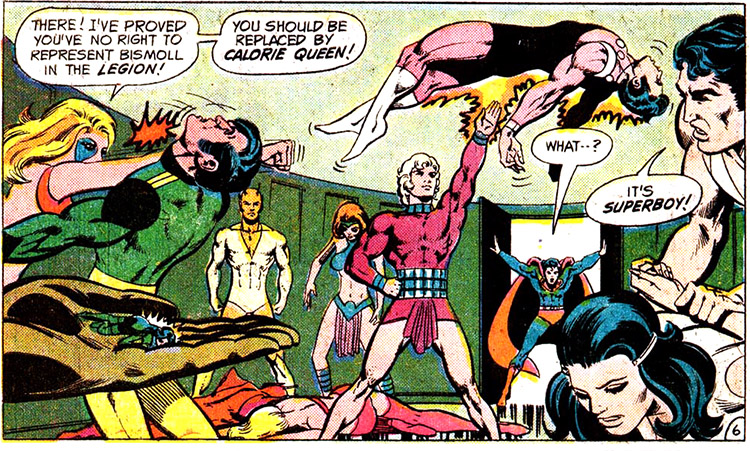 That same year, a similar group called the Legion of Super-Rejects rose to challenge the Legion. The Rejects were also made up of heroes who'd been turned down for Legion membership. This group of six in particular were rejected because they all duplicated the powers of existing Legionnaires. (Superboy #212) Some of these applicants (Esper Lass, Magno Lad and Micro Lad) were so incensed that they later turned to crime and joined the Legion of Super-Villains. (Legion vol. 3 #1) Calorie Queen (Taryn Loy of Bismoll) went on to a more productive career, (Legion vol. 4 #10) and Chameleon Kid (Toog Lintens of Durla) and Phantom Lad (Solon Darga of Bgtzl) were never heard from again.