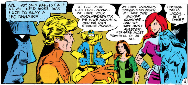 The League of Super-Assassins was formed by disgruntled teens from the planet Dryad. These teens were manipulated by the Dark Man into believing that the Legion was responsible for the destruction of their homeworld several years earlier. The League—Blok, Lazon, Mist Master, Neutrax, Silver Slasher and Titania—swiftly took out some of the most powerful Legionnaires. (Superboy & the Legion #253) They were defeated by Brainiac 5 and the Legion of Substitute-Heroes. (#254) Blok went on to repent and even join the Legion! But even though the League learned that Legion was innocent, the others chose the path of evil and later joined the Legion of Super-Villains under Nemesis Kid.