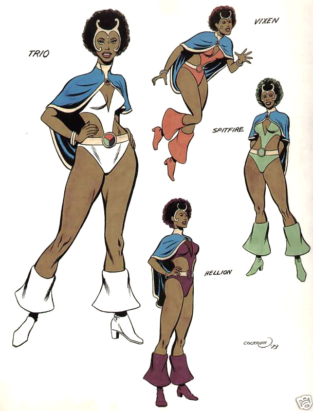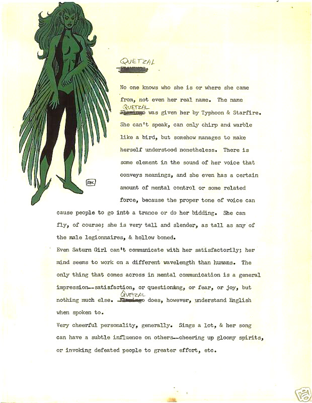 Cockrum: "That's right, and the only one of the four that they used was the one I originally named Starfire, but who wound up being called Wildfire after being named Erg-1 for a while. But I also had a guy who was a weather handler called Typhoon who had a flowing cape with a dark cape with yellow trim. And I had a girl who had wings but not out of her back: they were from her arms like bird's. She was green and her name was Quetzal and she had long flowing hair. If you put Quetzal and Typhoon [he meant Trio, not Typhoon, ed.] together you got kind of a strange version of Storm."