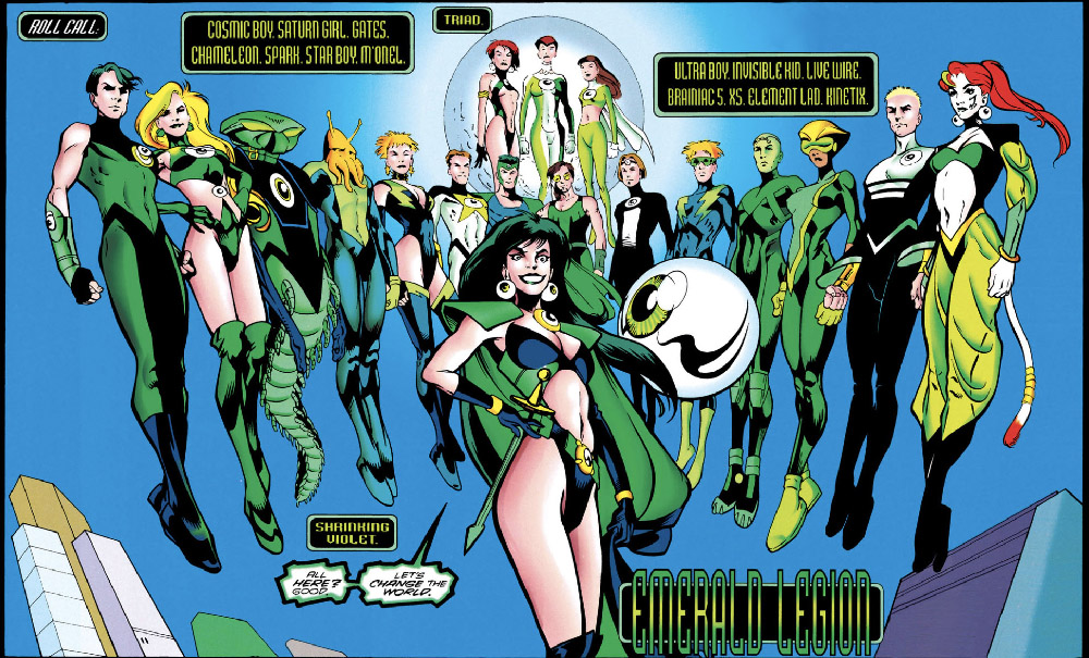 Apparition (Tinya Wazzo, first appearance) and Triad join; first appearance Atmos (Marak Russen), Brainiac 5 (Querl Dox), Chameleon (Reep Daggle), Gigi Cusimano, Invisible Kid (Lyle Norg), Kid Quantum (James Cullen), Leviathan (Gim Allon), Rond Vidar, Star Boy (Thom Kallor), XS (Jenni Ognats) and Ambassador Winema Wazzo.