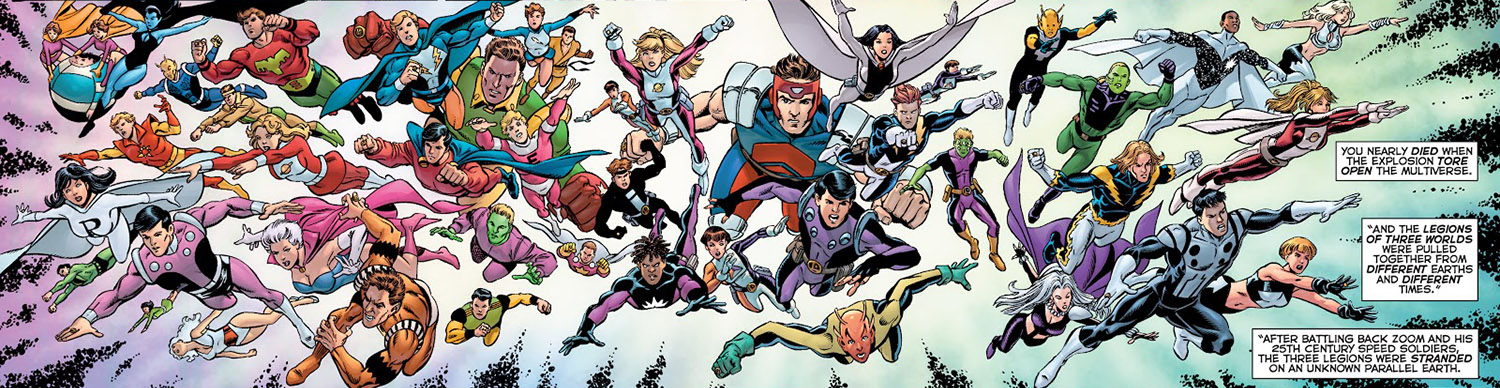 The original meeting of Legions from three universes. From Final Crisis: Legion of Three Worlds #3 (2008); art by George Pérez and Scott Koblish.