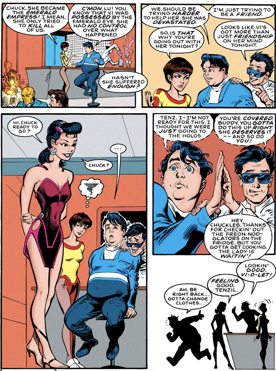 He even discovered that the Legionnaire Triad (at least one of her selves) may have a crush on him. (Legionnaires #59) But Chuck went on a date with Leviathan (aka Shrinking Violet) instead. She was attracted to his charm and wit, and also comforted that he liked her both before and after her fateful transformation by the Emerald Eye. Triad was jealous that the two of them went on a date, but afterwards Violet realized that Chuck only had eyes for Triad. (Legionnaires #66)