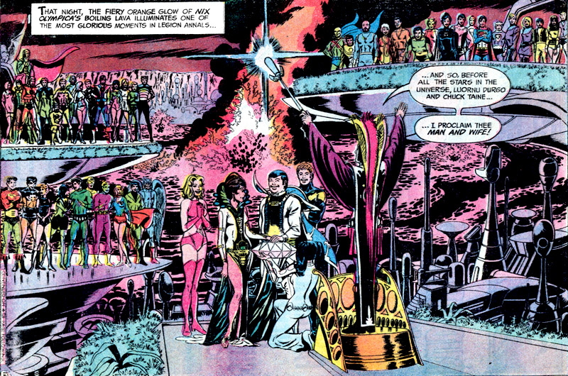 This victory was bittersweet when Chuck soon learned that yet again his powers were waning. He decided it was time to retire from the Legion permanently. He summoned his courage and proposed marriage to Luornu — knowing also that there was a rule that prohibited married Legionnaires from serving in active duty. They would become the Legion's first married couple, but before the ceremony, it appeared that Luornu had also lost her super-power. After the ceremony at Nix Olympia on Mars, they both resigned from the Legion and became Legion reservists. The Legion soon discovered, however, that her second body (Lelith again?) had been kidnapped by Starfinger in an attempt to learn the secret of Carggite duplication. (Superboy #200)