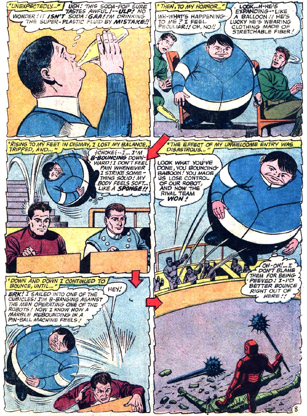 Young Chuck Taine was an "errand boy" for a scientist in Metropolis. One day he was entrusted to deliver a special super-plastic fluid to the Science Council, but on the way Chuck was enticed by a Robot Gladiator tournament. In his excitement, he accidentally drank the plastic serum instead of his soda — and gained the power to inflate his body and bounce like a rubber ball! (Adventure Comics #301, Secret Origins vol. 2 #49) Note: Bouncing Boy's real name was first revealed in Superman Annual #4 (1961).