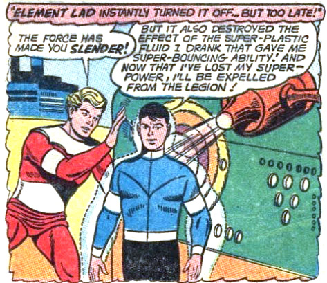 Before long, Chuck lost his powers. While practicing one day, he accidentally bounced in front of a matter-shrinking machine that (while it made him more slender) sapped his super-power. He could no longer serve as an active Legionnaire and was awarded permanent reserve status. He introduced his friends to his new girlfriend, Iresa. (Adventure Comics #321)