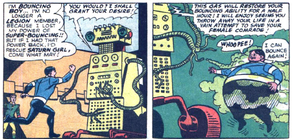 A coup by the evil computer called Computo sparked a different passion in Chuck. When Computo murdered one of Triplicate Girl's selves, the powerless Bouncing Boy leapt into the fray. Computo was amused by him and exposed him to a gas that restored his super-power for a half-hour. He tried unsuccessfully as his friends had to bring down the tyrant, but the power faded again. (#341)