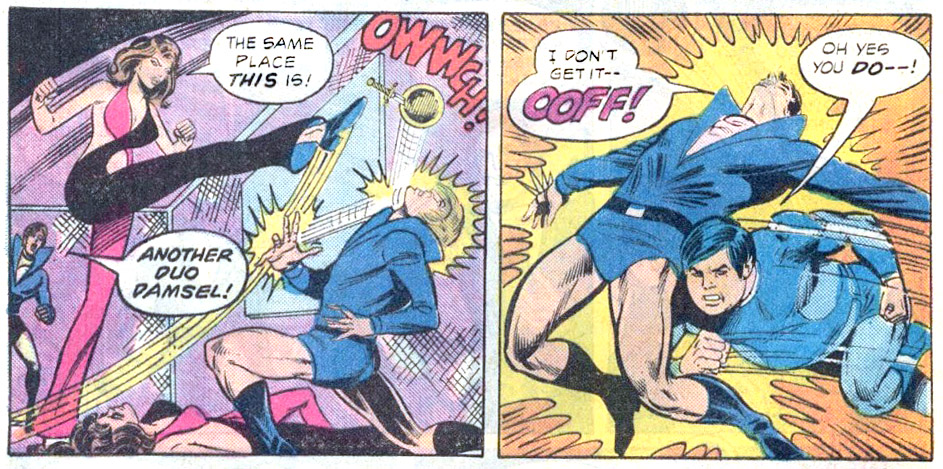 When the Legion's greatest enemy, Glorith, kidnapped Luornu and her former fellow conspirators, they learned that Glorith had also saved Duo Damsel's second self from permanent death! The Legionnaires freed her and Chuck's wives were reunited. (#42)