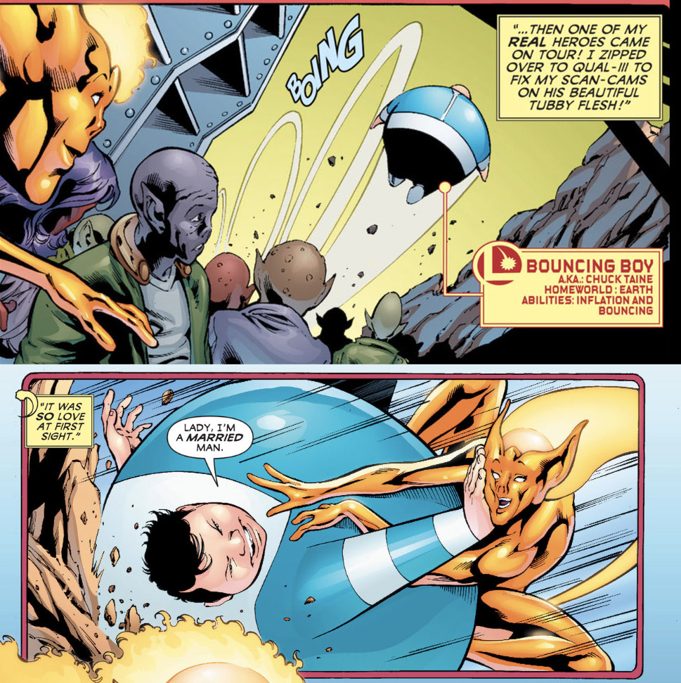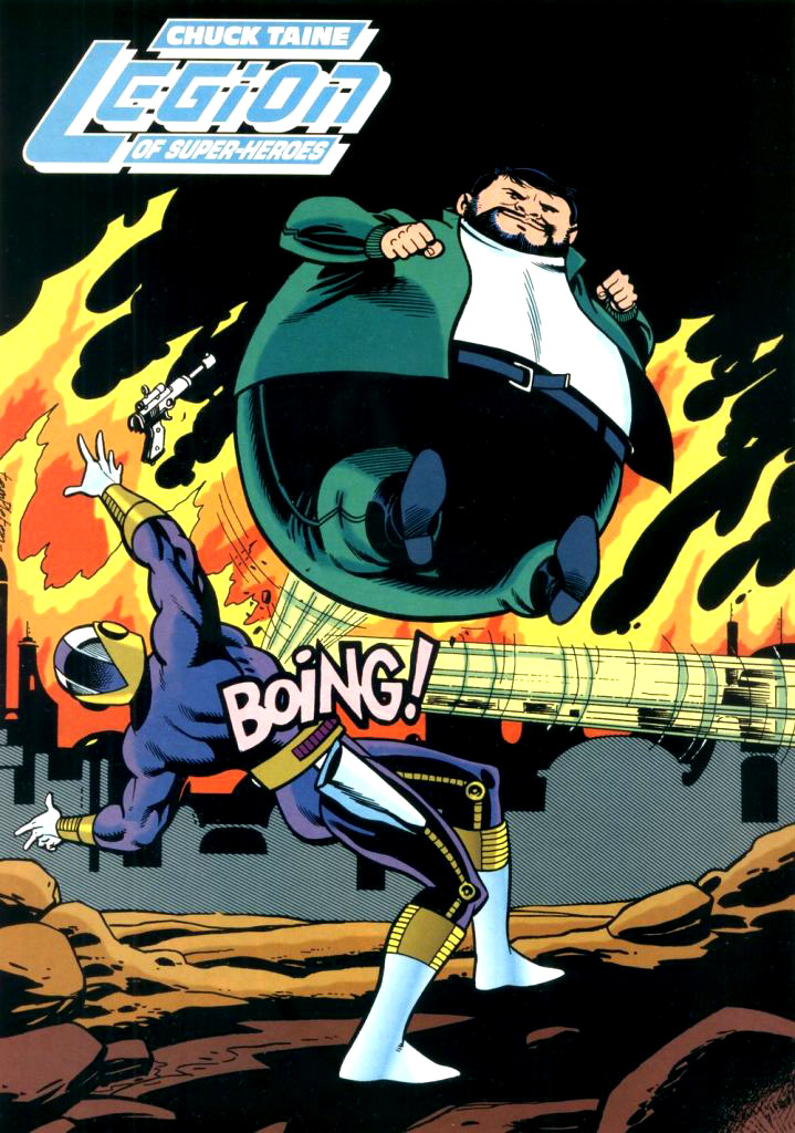 Charles Foster Taine has a doctoral degree in metaphysical gateways. He was recruited by the Legion of Super-Heroes when they learned of his "level eight" super-powers. He is so invulnerable when his body inflates that they wanted to call him "The Bullet." But Chuck preferred to emphasize his ability to rebound against things and joined them as Bouncing Boy. (Legion vol. 8 #9)