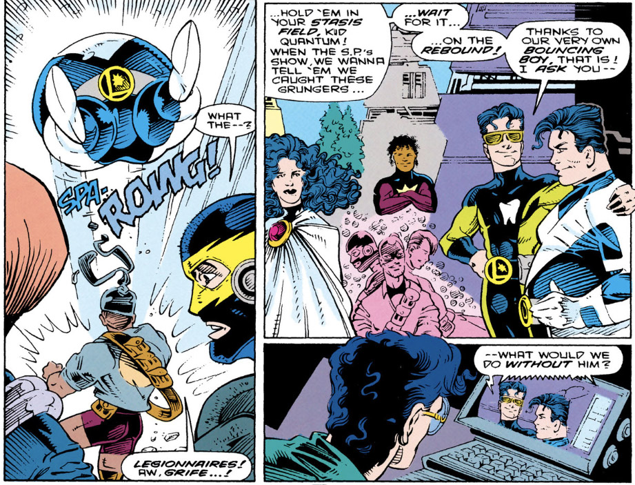 The "SW6 Legion" was a complete duplicate of the Legion from their early days. These "chronal duplicates" were created by the Time Trapper, but they were created at a time when Bouncing Boy was not a member. There was no SW6 B.B. until the crisis in time called "Zero Hour" began to warp reality. A teen version of Bouncing Boy appeared then, as if nothing was amiss. (Legionnaires #16) Soon after this, however, this reality ceased to exist