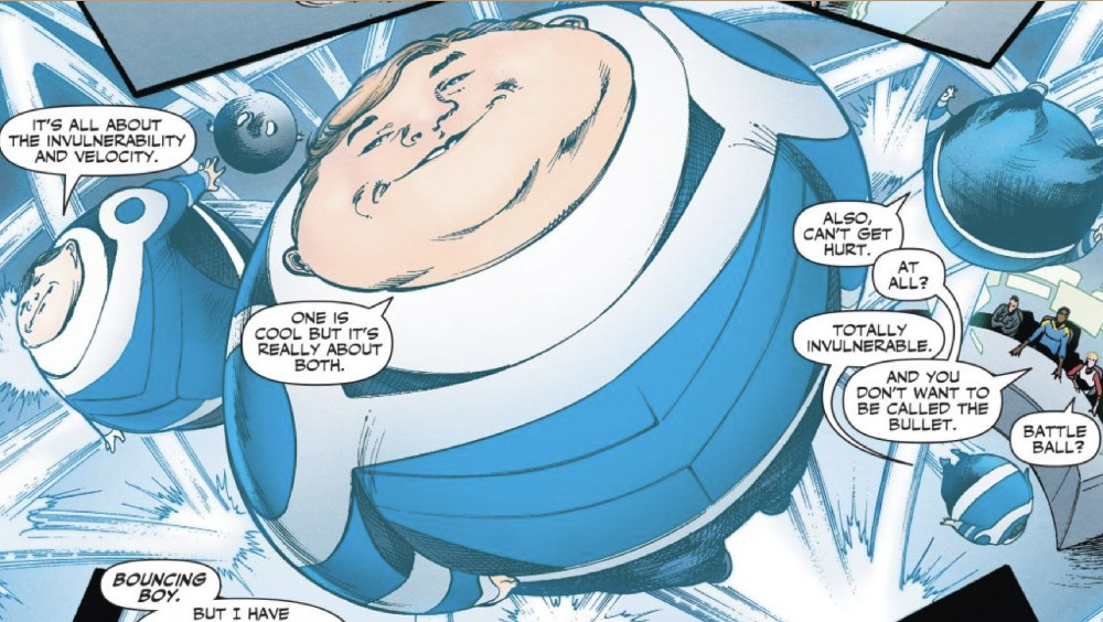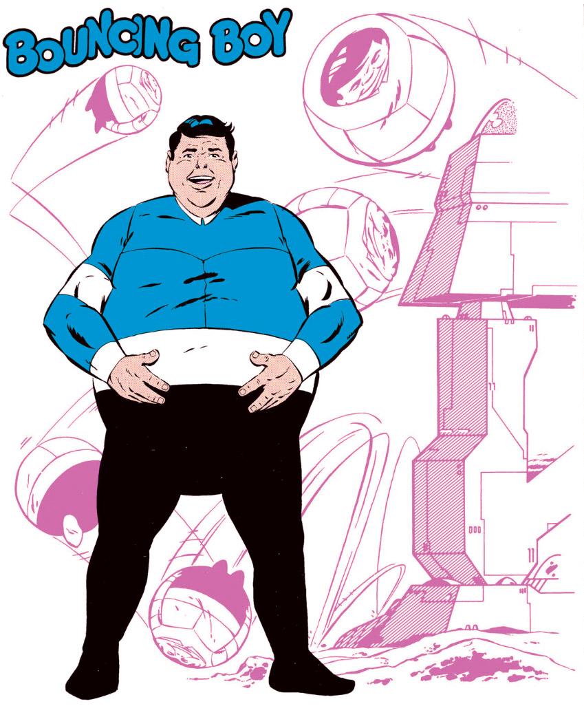 Bouncing Boy can "inflate" his body, and in doing so becomes nearly invulnerable yet pliable enough to ricochet off surfaces.