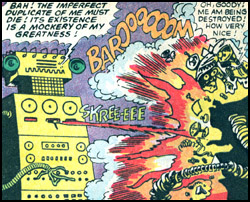 By this time, Brainy had gone truly mad and his unrestrained genius created two powerful threats. He accidentally transformed his friend, Professor Jaxon Rugarth, into the psychotic, nearly all-powerful Infinite Man. (#233) Then he used the Controllers' Miracle Machine to create the virtually unstoppable Omega. (#250) The Legion called in the former Legionnaire Matter-Eater Lad, was able to consume the Miracle Machine and stop Omega, but at the cost of his own sanity. Following this case, both Brainiac 5 and Matter-Eater Lad were remanded to psychiatric care. (#252, 273)