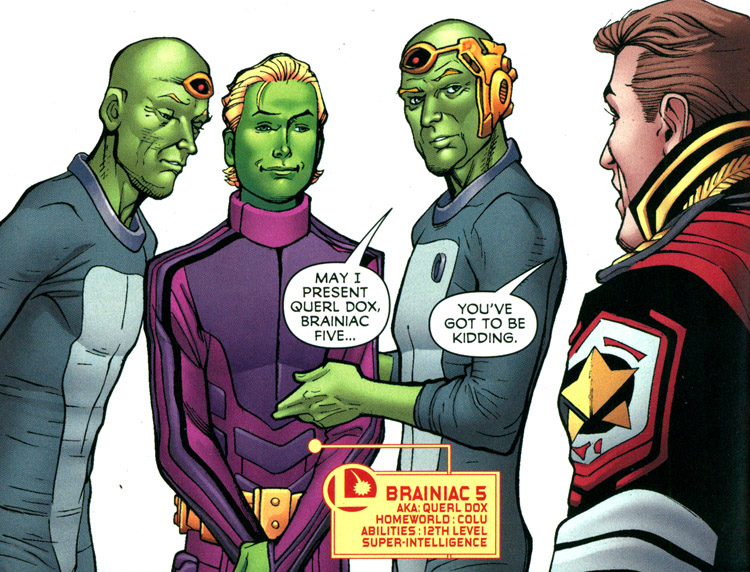 Querl Dox hails from the planet Colu, whose legacy includes advanced and a mastery of the technologies for miniaturization and force fields. He considers himself superior to most sentients, who possess merely 6th level intelligence. His own 12th level intelligence earns Querl the title of Brainiac. Most Coluans possess a 10th level intelligence. Brainiac 5's time with the Legion has been marked by great accomplishment, but also great tragedy, even deceit.