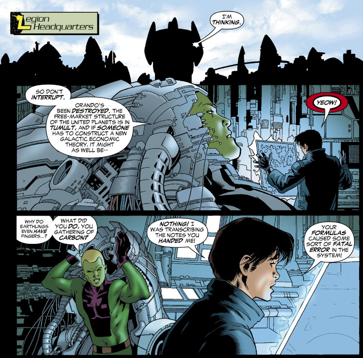 After Cosmic Boy disappeared, Brainy continued to pursue his own agendas within the Legion. He manipulated three missions which resulted in the arrest of Mekt Ranzz, (#33) boosting Timber Wolf's powers, and the recruitment of a potential new Legionnaire (E.R.G.-1). (#35)