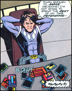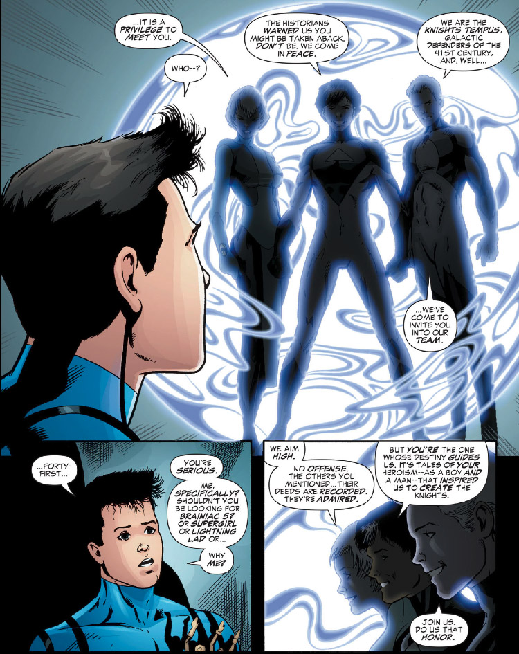 Before Cosmic Boy could face the public, he disappeared. Privately, he received a visit from three youths from the 41st century—the Knights Tempus. These three teens claimed Cosmic Boy's legacy of heroism had inspired their own team. They invited him to join them in the future. Cos has not returned since. (#30)