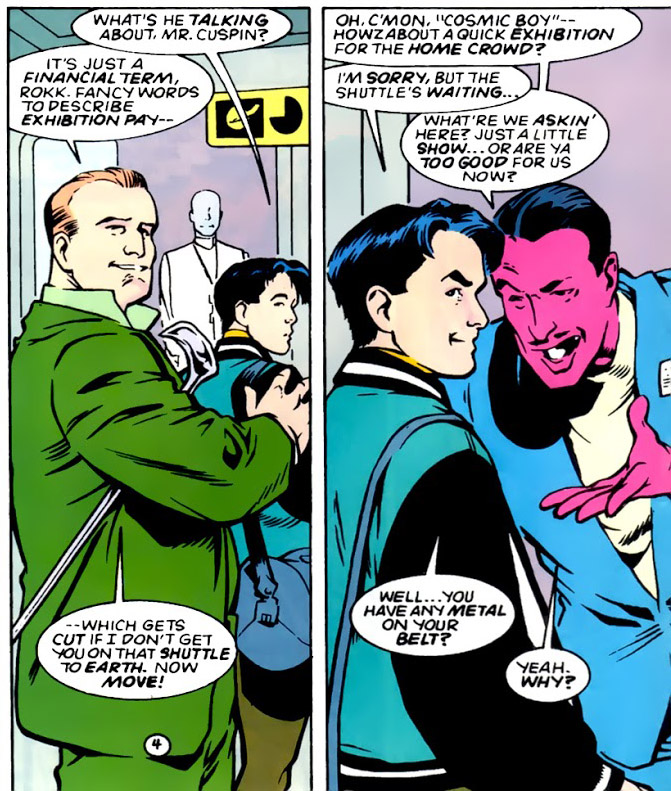 His last mission as leader marked a significant turning point for Cosmic Boy. The entire United Planets came under seige from the Dominators. To defeat them, Cos was forced to make the very difficult decision to order Mon-El back into the Phantom Zone—and take the Dominion with him. The public believed that Cosmic Boy had ordered the Dominion's destruction, but he could not reveal the truth to exonerate himiself. Mon-El was believed to have died, but his return to the Zone actually kept him from succumbing to lead poisoning. (#27-30)