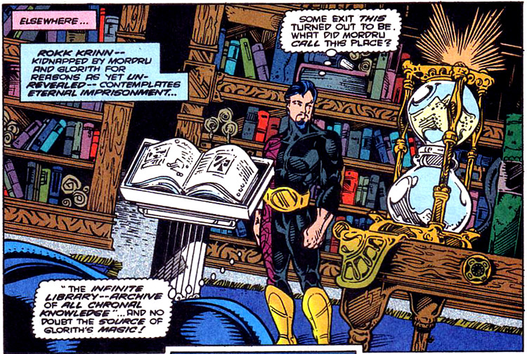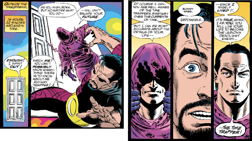 At the funeral for Laurel Gand, Rokk was kidnaped by Mordru and Glorith. They held him hostage in Glorith's keep—the Infinite Library of time. There he was trapped, so he began to read from the library. While consuming the annals of time, Rokk learned of the 30th century's ultimate fate—the Zero Hour. He remained for untold years, growing older then younger again. The infinite knowledge drove him mad with the drive to prevent the Legion's demise by any means necessary. To this end, he invented a new guise for himself: the Time Trapper.