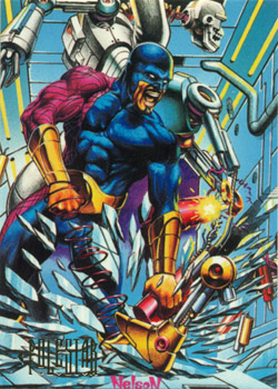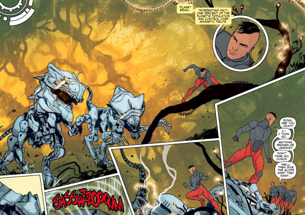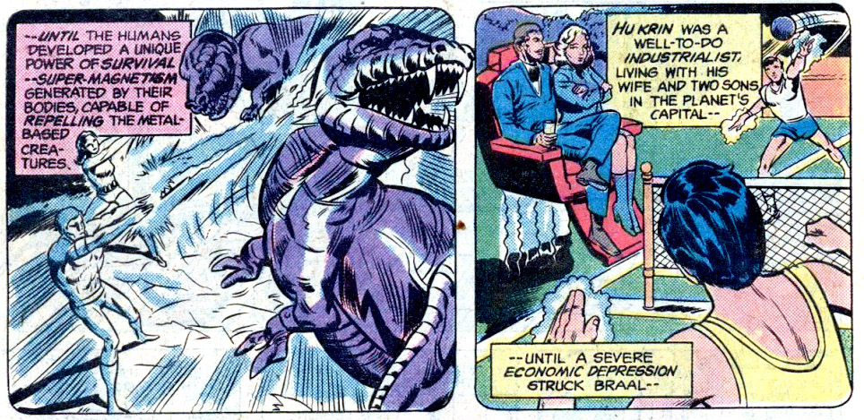 But although he was a hero, Braal was still a harsh world, and, when his planet went to war with Imsk, he was conscripted into its army, making sure to marry Lydda while he still could. He underwent the most shattering experience of his life, the massacre at Venado Bay. The Imskians had established a beachhead there, and, under the command of Salu Digby, the former Shrinking Violet, they set up a weapon called the damper - an object that would disrupt a Braalian's unique magnetic field. When the damper went off, Rokk lost his powers and his consciousness, and many Braalians lost their limbs or lives. When Rokk came to, he stumbled upon the Imskian camp, thinking that it was his own, and, when he heard of the presence of Imskians, slashed away with his laser-knife to get free. It's uncertain if he's even aware that it was he who slashed Shrinking Violet's eye...a scar she still wears to remember the atrocity in which she had been involved.
