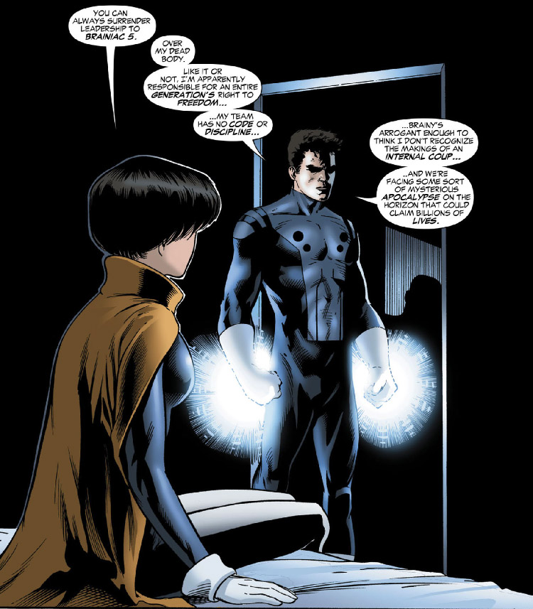But as the team grew, Cosmic Boy discovered new challenges to his leadership, primarily in the form of fellow Legionnaire, Brainiac 5. As the Legion began facing the growing menace of Terror Firma and their leader, Lemnos, Cos became paranoid about Brainy's covert plots. For good reason, too; Brainiac 5 was constantly undermining Cosmic Boy's authority.