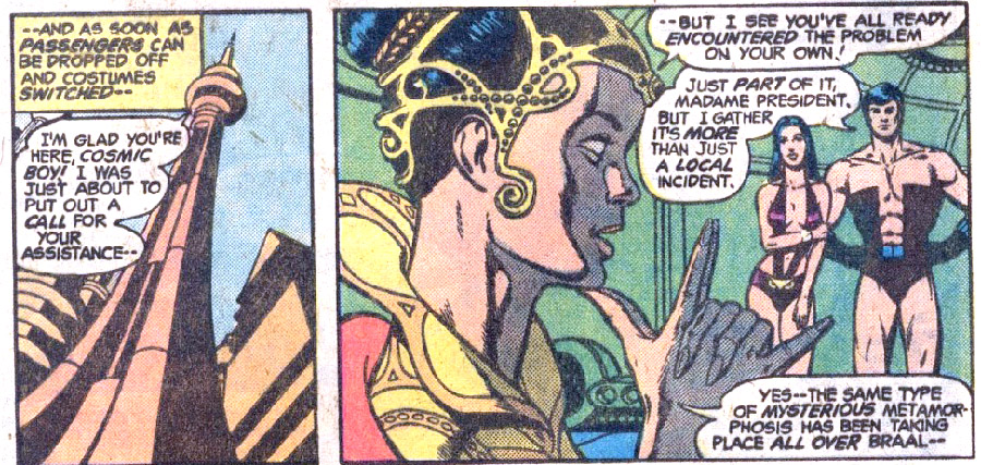 Cosmic Boy and Night Girl took a holiday to Braal that was interrupted by the Worldsmith, a powerful alien who remodeled planets for his clients. (Superboy & the Legion #236)