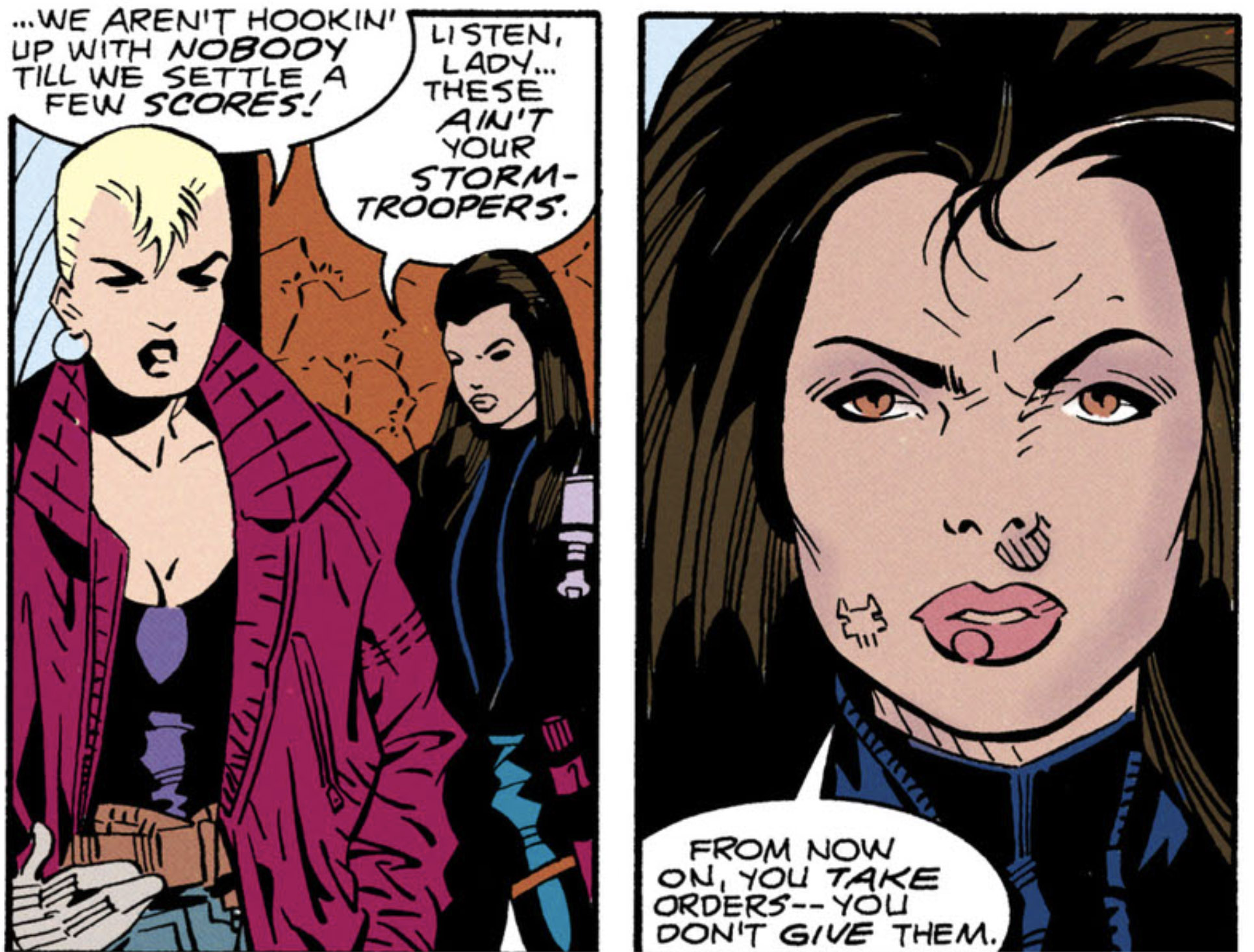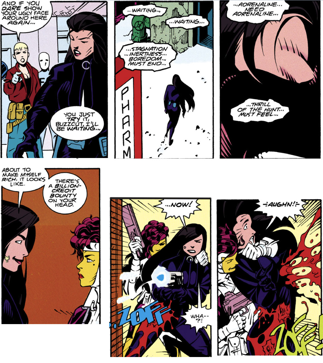 Bounty became allied with the SUBs, joining an underground battle to unseat the Dominators. She worked with former Dominator ally, Circe, to gain access to their Pinnacle Command. (#23, 29, 30)