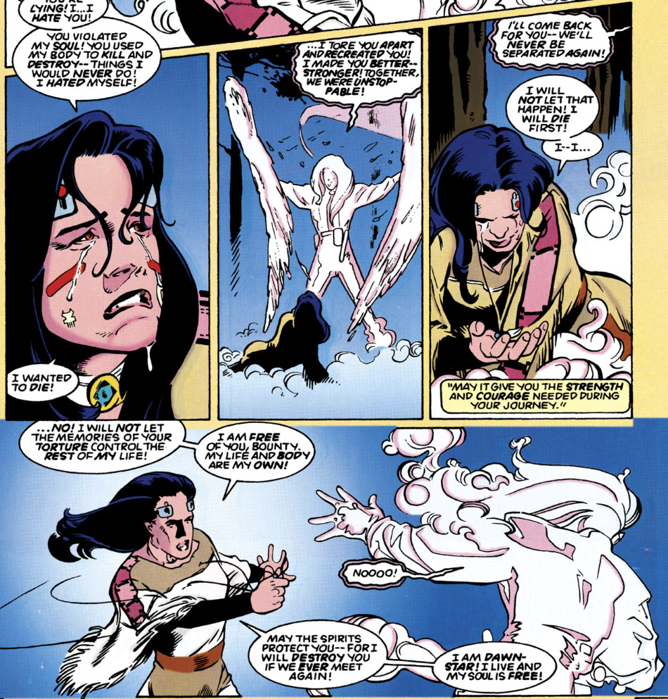 At some point, Dawnstar succumbed to possession by a noncorporeal entity. Brainiac 5 later noted the presence of an "unknown organic compound of intense sedative effect." This may have been produced by the entity. During this possession she also lost her wings. Taking the name Bounty, the entity totally assumed her life, becoming a bounty hunter. Dawnstar remained aware of its actions.