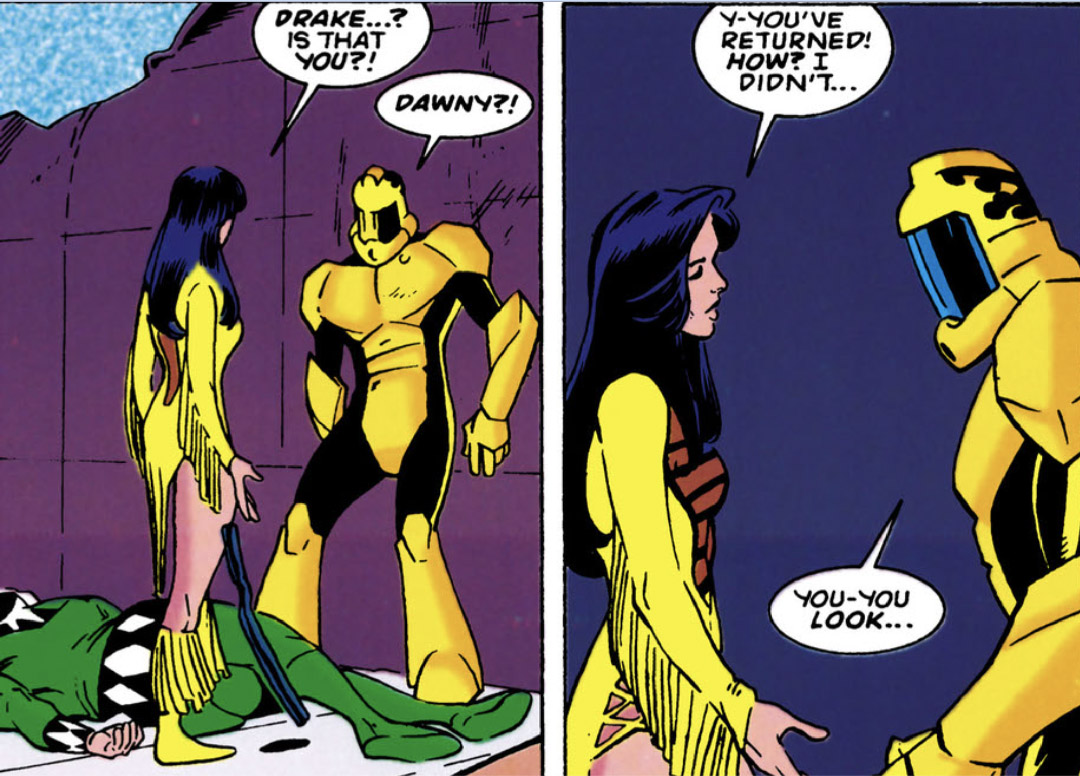 But doubts soon entered. One occurred when she and Brainiac 5 got stuck on a previously-unknown planet called Kol, where the local priests, believing her a demon, tried to kill her, and one, Jhodan, stopped them. (Tales of the Legion #321) Dawnstar found herself attracted to Jhodan, but the Legionnaires were forced to leave Exile after realizing their extraterrestrial germs were causing an epidemic. Dawnstar bid a sad farewell to Jhodan, promising to one day return. (#323)