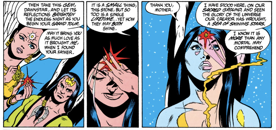 At age 18, it was time for Dawnstar to undertake the sacred matriarchal ritual of her people. She took a leave of absence from the Legion to begin a "grand tour" — the search for her soul mate. (Legion vol. 2 #304) On Starhaven, her parents gave her a special gem to assist her on her. While she did not hesitate to honor the tradition, she secretly professed her love for Wildfire. (#305)