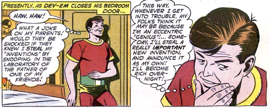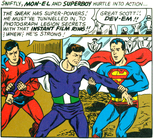 Dev-Em ultimately landed in the 30th century, where he broke into the headquarters of the Legion of Super-Heroes (of which, Superboy was a member). Superboy threatened to turn Dev-Em over to the Interstellar Counter-Intelligence Corps but Dev-Em revealed that he had actually reformed and was now working for the I.C.C. He'd come to Legion headquarters as part of his mission to infiltrate the Cosmic Spy League of Molock the Merciless.