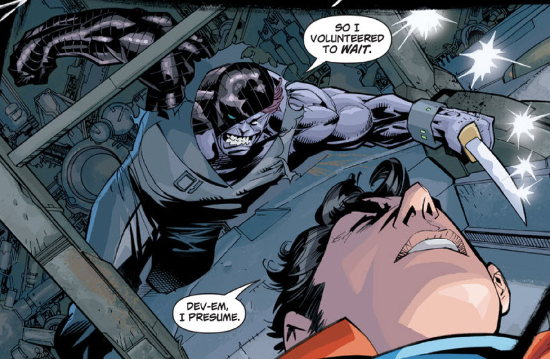 When the Man of Steel was trapped inside the Phantom Zone, he was attacked by the brutish Dev-Em, who'd been a prisoner at Fort Rozz when it was accidentally projected into the Zone on Krypton. (Action Comics #851)