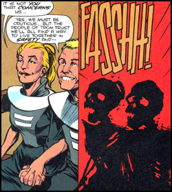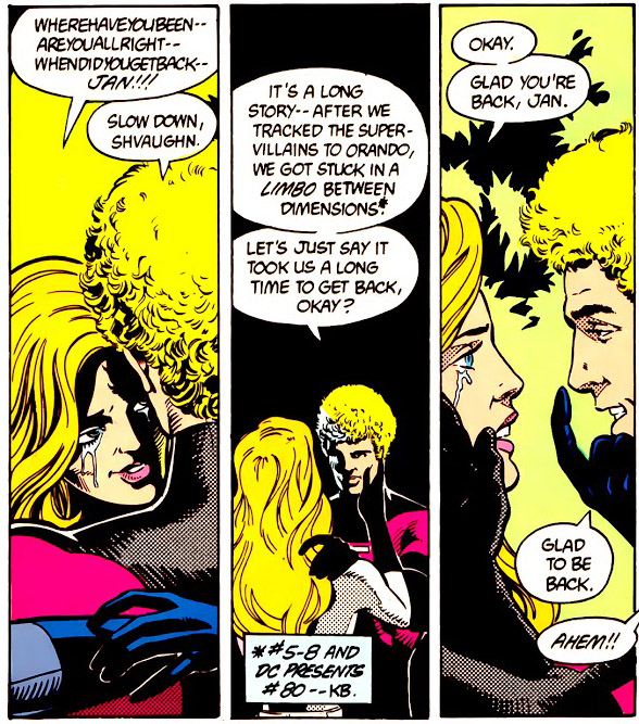 Jan and Shvaughn made a good team. They worked together to investigate suspicious things surrounding the Legionnaire Shrinking Violet and eventually uncovered the fact that she'd been replace by a Durlan spy. (Legion vol. 2 #304)
