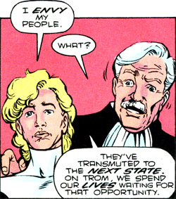Jan considered most aliens to be conservative; he, for example, felt no need to wear clothes. He believed that his service in the Legion was consistent with Trommite spirituality: to be at the nexus of great change. (#3) During his time with the Legion, he served faithfully without rocking the boat. He also preferred pacifism and diplomacy to physical combat.