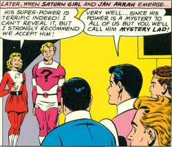 Jan went on the run from Roxxas, finding refuge in the Legion of Super-Heroes. Because his power might tip off Roxxas to where he was, he revealed it only to then-leader Saturn Girl and joined as "Mystery Lad." Only after the Legion captured Roxxas did the shy young boy take the name by which he is better known: "Element Lad." (Adventure #307)