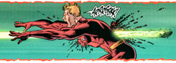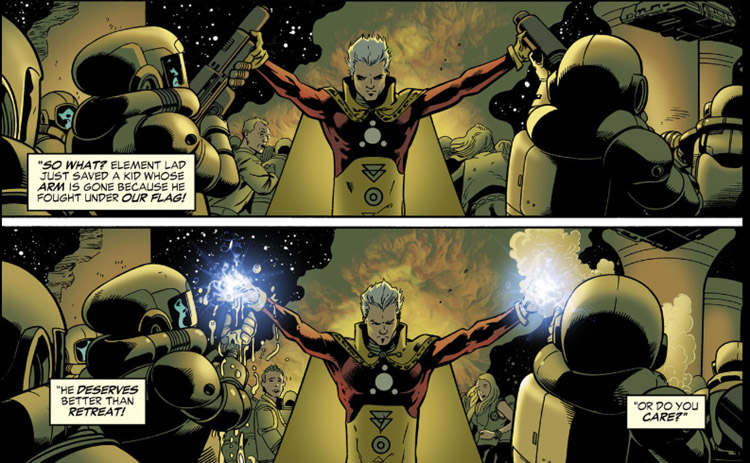 Tom & Mary Bierbaum on Element Lad: "Came out of a society that had to teach their offspring from infancy not to turn their playmates into molybdenum anytime they get into a fight over the tinker toys. So he's a youth of vast discipline and spirituality. That's meant all these years he's been secretly, methodically dealing with the unspeakable horror of Roxxas' slaughter, coping in his own intensely private way. That's meant there's such disconnect between Jan's physical impulses and what his mind allows him to act upon, that questions of sexuality (yes, he's gay) are almost irrelevant." —Interlac (2000)
