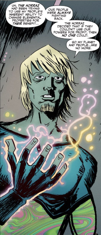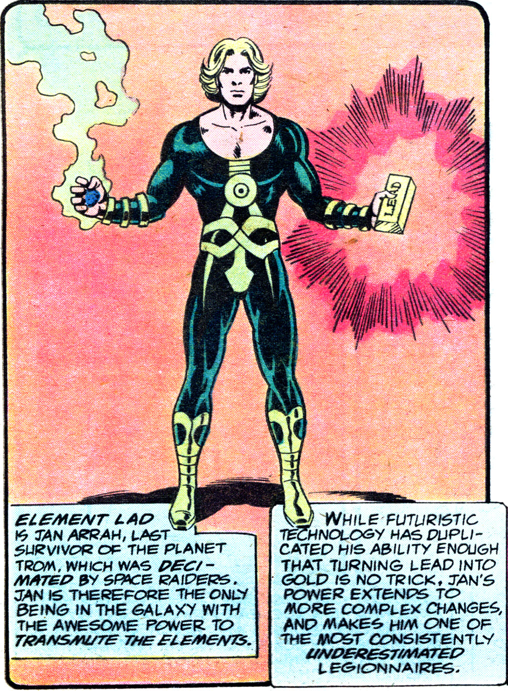 Element Lad was born on the planet Trom, where people could transmute the very elements around them. The alien Horraz race tried to enslave these people, to use their ability for financial gain. After fighting the Horraz for years, the tyrants chose simply to exterminate the people of Trom. Jan Arrah was the planet's sole survivor.