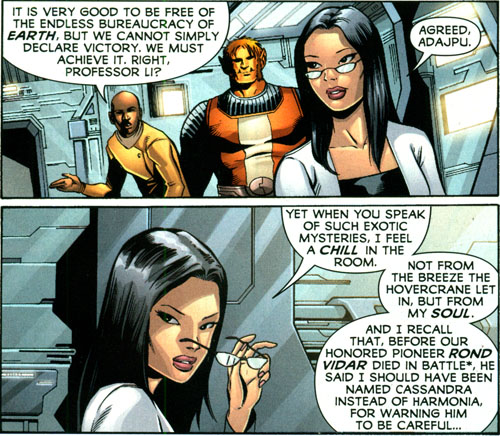 Li first appeared to the Legionnaires as a member of the Time Institute, which had just moved to Titan. When her colleague, Adajapu tried to view the origins of the universe, a fierce backlash destroyed the environmental controls over Titan. Swift action by the Legionnaire Saturn Girl wasn't enough to save her home moon-planet and the result was the utter destruction of Titan (Legion vol. 6 #1) Harmonia survived and migrated with survivors to Naltor. There Brainiac 5 sought her help in repairing his Time Bubble, at which time she intimated that she was from "old Earth." (#7)