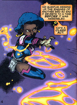 Jazmin Cullen had those same powers incorporated into her body. Xanthan genetic engineers were able to graft the powers of the original Kid Quantum's belt to her. She now has a natural command of the quantum field and uses it to create stasis and force fields, null gravity, null time, and concussive force. As she's gained experience with her powers, Jazmin has become potentially one of the most powerful Legionnaires. Not only can she speed and slow time, she has even used her powers to travel through time.