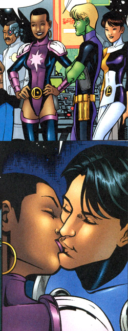 In the Legion, Jazmin's star rose rapidly. Not long after joining, Earth was attacked by the Blight. The battle against the Blight ended in the creation of a spacial rift, into which Kid Quantum and other Legionnaires fell. (Legion vol. 4 #125) They spent time in a so-called "Second Galaxy," and there Kid Quantum's confidence and leadership ability matured. They fought hard to return home (The Legion #1), and when the Legion was reformed, Jazmin was elected as Legion leader. What's more, she found herself in a budding romance with Cosmic Boy. (#10, 26)