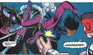 His pride was a detriment during his first Legion mission, against an alien insectoid called Tangleweb. James ignored Leviathan's orders and tried to take on the creature himself. He managed to catch Tangleweb in a time-stasis field, but while he stopped to brag about it, the strain of it shorted out his belt. Tangleweb broke free and snapped James's neck. Kid Quantum was the first Legionnaire to die in action. (Legion vol. 4 #62) After his death, his funeral was harrassed by White Triangle terrorists, who booby-trapped his coffin. Legionnaire XS saved everyone in the vicinity from its blast. (Legionnaires #19)