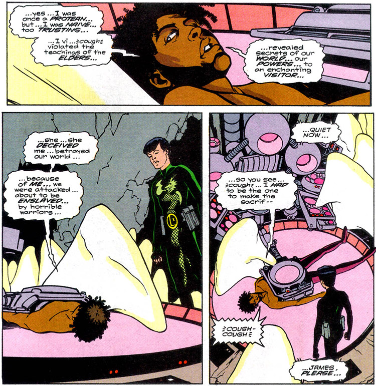 Tom & Mary Bierbaum on Kid Quantum: "His time in the Legion was shrouded in secrecy and the shame of a terrible personal secret (he was the Proty that unwittingly betrayed his race and caused its near-enslavement by Glorith). Guilt and regret have turned James into a being of enormous conscience and gentle wisdom. The Gandhi of the team." —Interlac (2000)
