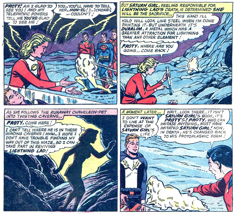 When the Legionnaires performed a ritual to revive Lightning Lad, Proty sensed that Saturn Girl was going to sacrifice herself. He tricked her and sacrified his own life instead. (Adventure #312)