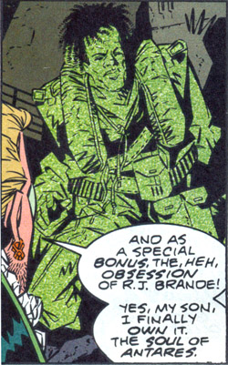 Finally, Proty II confided in the Legion's financier, R. J. Brande (who was also a shape-shifter locked in a human form), and convinced him to spearhead their search. Brande and his son, Chameleon Boy, eventually converged on the far-off world of Yal, where Kid Quantum had been hiding. They prevented the Hunter from capturing Quantum for the Dominion. But then another player swooped in to kidnap the prize: Brande's nemesis, Leland McCauley IV, who possessed the Emerald Eye. (Legion vol. 4 #33) The Legion soon freed them and Kid Quantum returned to Antares II. (#39)