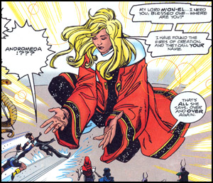 The world has mourned her as a heroine, but Andromeda actually survived the blast. She turned herself in voluntarily to the President of the United Planets, and was imprisoned on "Planet Hell" (a fact known only to Cosmic Boy). Later, Cos sent Live Wire to free her when the deadly Fatal Five attacked. (Legion #80) Although she was redeemed and pardoned, she declined to rejoin the Legion. (Legionnaires #37) Instead she joined a religious order called the Sisters of the Eternal Cosmos, dedicating her live to helping beings in trouble—including M'onel, once. (#46)