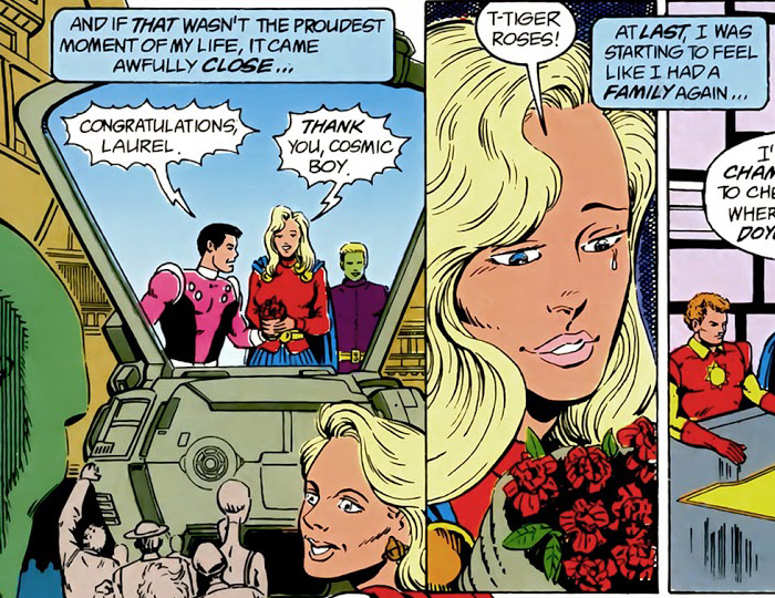 There has been fan speculation about whether Laurel Gand ever assumed any codenames. First, there is her origin story from Legion of Super-Heroes vol. 4 #9 (July 1990). In the scene where she is inducted to the Legion, leader Cosmic Boy gives her a bouquet of tiger roses. It's an odd moment that seems to suggest some extra meaning. There are numerous references online to her using the name "Tiger Rose," however, this name never appears in any DC story or text.