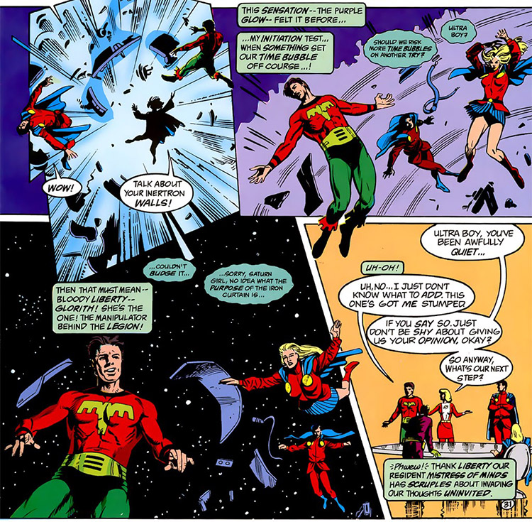 Second, when the Legion went "on the run" (Legion vol. 4 #54, 1994), team members all took new aliases — except Laurel. In that issue, Mysa says to Laurel: "Wait, er… 'Thelma' …" This is not a convincing case for an official new codename, and like the one above, it never appeared again (despite similar online references).