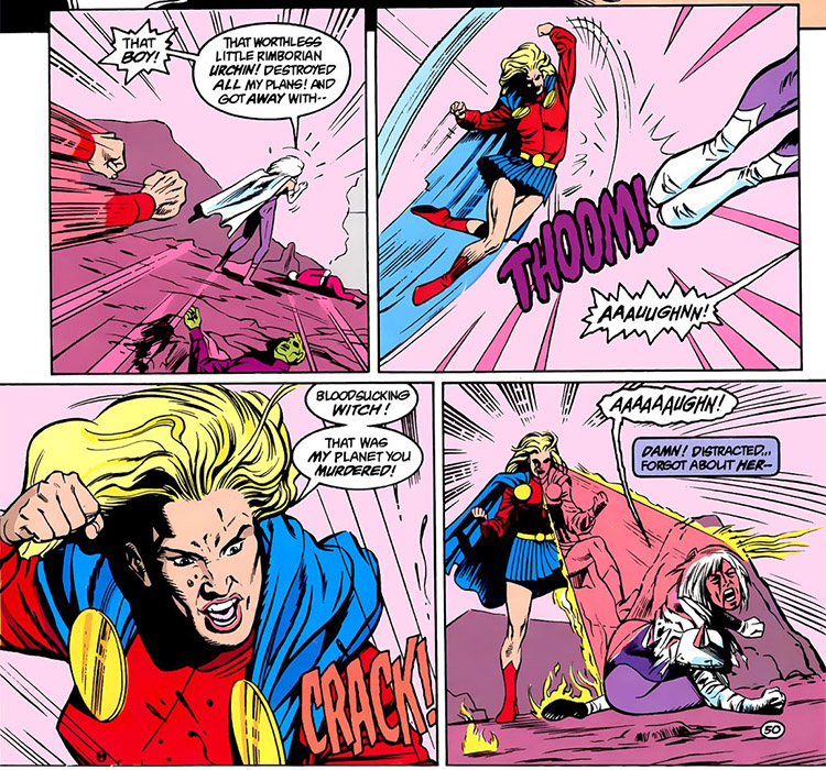 "We tried to give Laurel an origin that contained elements of the Supergirl history but that were clearly her own. While this seemed like the obvious way to go, we probably would have done ourselves a big favor by just doing a completely new story. Editor Michael Eury and Keith weren't very pleased when our script included countless references to the early Supergirl appearances as reference for the artist. Michael and Keith didn't want the story to look like a juvenile comic of the late '50s/early '60s, nor did Michael relish xeroxing countless panels out of old issues."