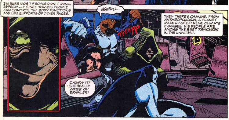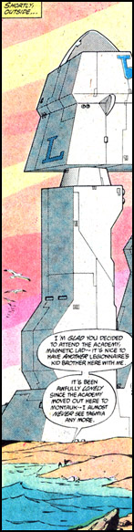 This Academy was established not by the Legion, but by their governing authority: the United Planets. As such, any world could send candidates for training. Their ranks were first populated by a weak trio of misfits: Tomb, Cannus (Cahvey Cannus) and Brawler. They were escorted to the Academy's headquarters Warnabros by Legionnaires Apparition and Andromeda. (Showcase '95 #6)