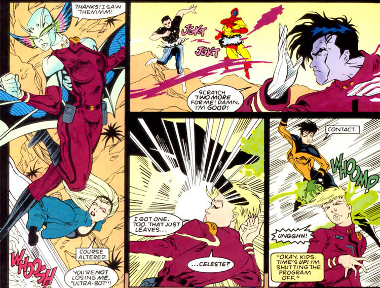 The Militia flourished with peace in the galaxy. Chuck and Luornu greeted old friends from the Academy and the S.U.B.S. (who took up their codenames again) while continuing to train new recruits like Quake, R327 Stun, (#54) Dragonfly, Jagged, Mara Williams and Ringtoss. A few familiar faces joined them as well: Yera Allon (Shift), Tiger Girl, and Xera. These young heroes faced another Khund attack, but were unable to prevent the assassination of Starfinger III. (#57)