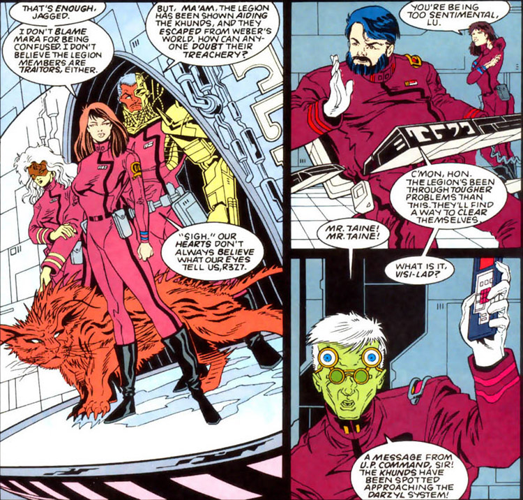 Just as the Legion was reforming, the alien Khunds (goaded to action by Glorith) began to attack United Planets worlds across the galaxy (especially the outer worlds nearer to Khundish space, including Xolnar, Orando and Talok VIII). The Legion agreed to fight alongside the U.P. forces. Jed Rikane (Power Boy) was one of their commanders. The Khunds attacked the Militia's home base, and commander Berta Haris (Nightwind) was killed. (Legion vol. 4 #15)
