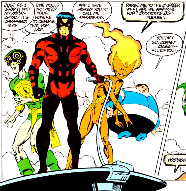 Soon they were joined by Comet Queen and Cosmic Boy's brother, Magnetic Kid. The students were undeterred by rejection, and applied once again to the Legion membership committee. Though some applicants were impressive, the committee remanded all for further training: "better no new Legionnaires than another dead one." (#304)