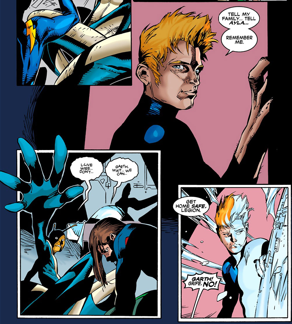 The lost team confronted Element Lad, about whom they learned had lived for millennia and transformed into the near-omnipotent Progenitor. The Progenitor was a monster. Although he restored Garth's arm, Live Wire struck against his old friend when he found the opportunity. Just as the Legion found their opening to return home, Live Wire sacrificed his life to destroy the Progenitor rather than risk the villain following them through the warp back to Earth. (Legion: Lost #12)